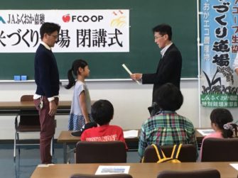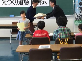 JAふくおか嘉穂さんから終了証書と新米元気つくしが手渡されました。JAふくおか嘉穂さんには、14年間この米づくり道場を継続いただいています。