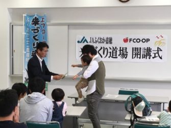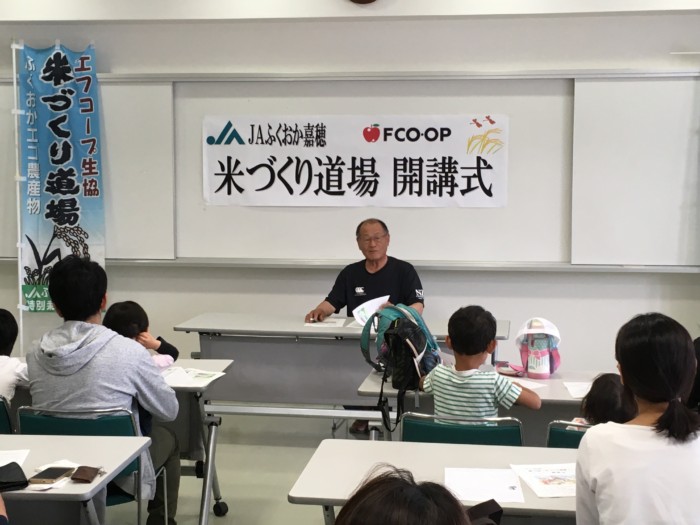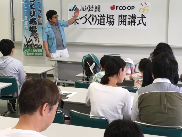 イベント情報 2019年05月20日 第15回米づくり道場開校式・くれ返しが開催されました 5月19日(日)産直米を生産・供給いただいているJAふくおか嘉穂ご協力のもと、米づくり道場開校式とくれ返しが開催されました。米づくり道場は、組合員の皆さんに米づくりを通じた農業体験をしていただくことを目的に開催されています。今年で第15回目の開催となりますが、当日は6家族20名の皆さんが参加されました。これから田植えや稲刈りなどの体験を通じて、農業のすばらしさを体験し学ばれます。 JAふくおか嘉穂さんよりご挨拶 内野営農組合上揚(かみあげ)支部さんよりご挨拶 ライスセンターより挨拶 JAふくおか嘉穂さんより、JA概要についてご案内。その後、参加者の皆さんの自己紹介と入講書が授与されました。 開校式終了後、田んぼに移動してくれ返しの作業を行いました。皆さんトラクターにのって楽しく自然を体感されていました。 参加者とJAの皆さんで記念撮影 お世話になる内野営農組合上揚(かみあげ)地区の皆さん。 自然豊かな場所で開催されます。実りある秋を迎えられますように。