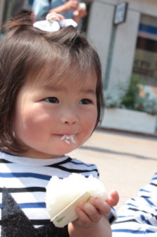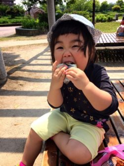 箱崎公園にお弁当をもって遊びに出かけた時の写真です。公園で四つ葉のクローバーを見つけ、この日にパパの転職先が決まった、思い出の1枚です。真琴はごはんが大好きです。先日、阿蘇でトロッコ列車に乗った時も、稲穂の実った田んぼを見てずっと「お米!お米!おーこーめー!」と叫び続けていました。しまいには、雑草畑にも、「お米ー!」と叫んでいました。