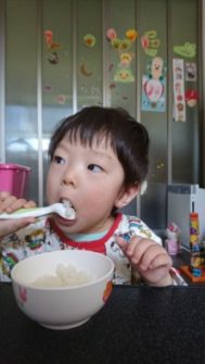 毎食モリモリ、米粒たべてます!炊きたてが大好きでスプーンを持って直接食べにきました!! 大きく育ってね。