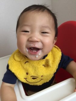 離乳食を始めたばかりの頃です。ご機嫌でこんなに笑顔なのに 数時間後高熱を出して 入院しました…。思い出の一枚です。今も モリモリ食べています!