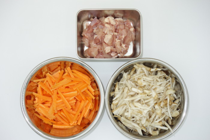 鶏もも肉は1~2㎝角の角切り、ごぼうはささがき、にんじんは千切りにします。