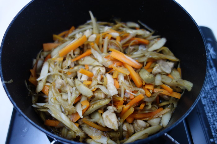 鍋に1.の材料とうまくちしょうゆ(お好みで砂糖も)を入れ、煮汁が少なくなるまでしっかり煮込みます。