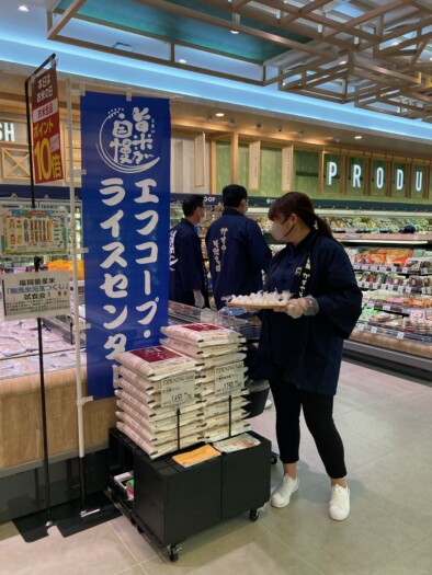 活動報告 2023年07月19日 かすや店大試食会 7月16日、かすや店オープニングセール第4弾「大試食会」に参加させていただきました。 JA粕屋・JA全農ふくれんのみなさまと一緒に、「元気つくし」の試食を行いました。 生産者の方にもご参加いただきました 組合員さんより、「無洗米でもおいしかった」「試食が再開されたんですね」との声がありました。 元気つくしは冷めても、粘りやもちもち感があるお米で、お弁当にもおすすめなので、ぜひお試しください🍙 JR酒殿駅近くに、先月オープンしたばかりのエフコープかすや店の様子でした♪
